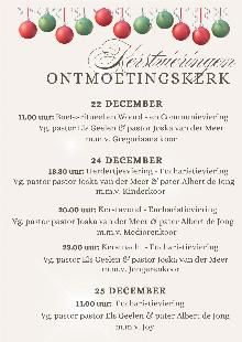 Op Eerste Kerstdag begint de viering om 11:00 uur m.m.v. koor Joy, en op Tweede Kerstdag is er géén viering.